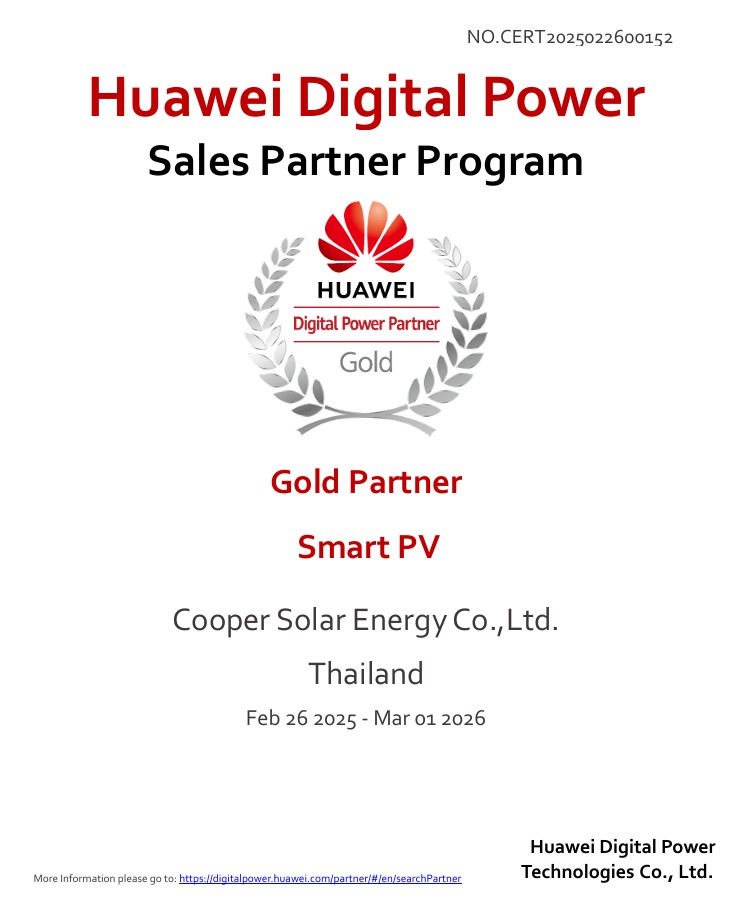 นอกจากนี้ เรายังเป็นตัวแทนจำหน่ายอย่างเป็นทางการระดับ Gold Partner จาก Huawei Digital Power ผู้ให้บริการผลิตภัณฑ์และโซลูชันด้านพลังงานดิจิทัลชั้นนำระดับโลกอีกด้วย
